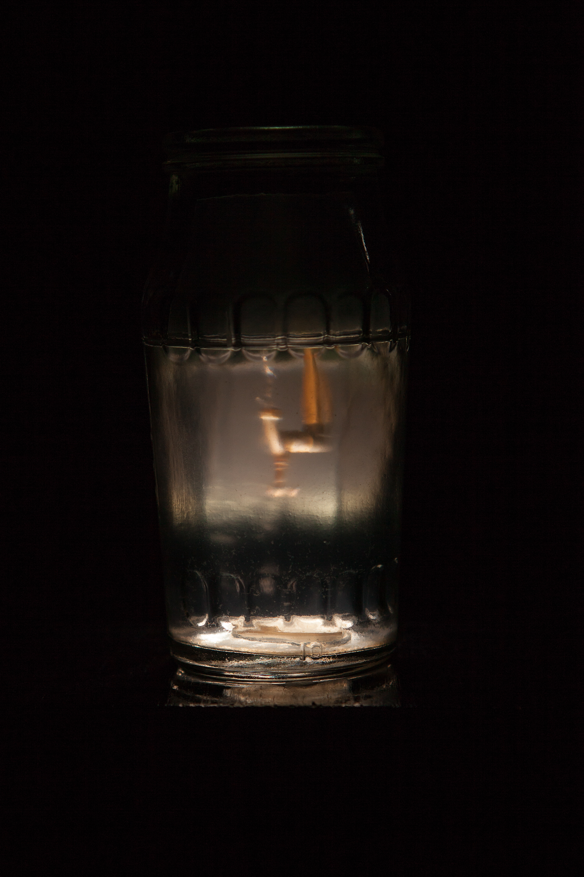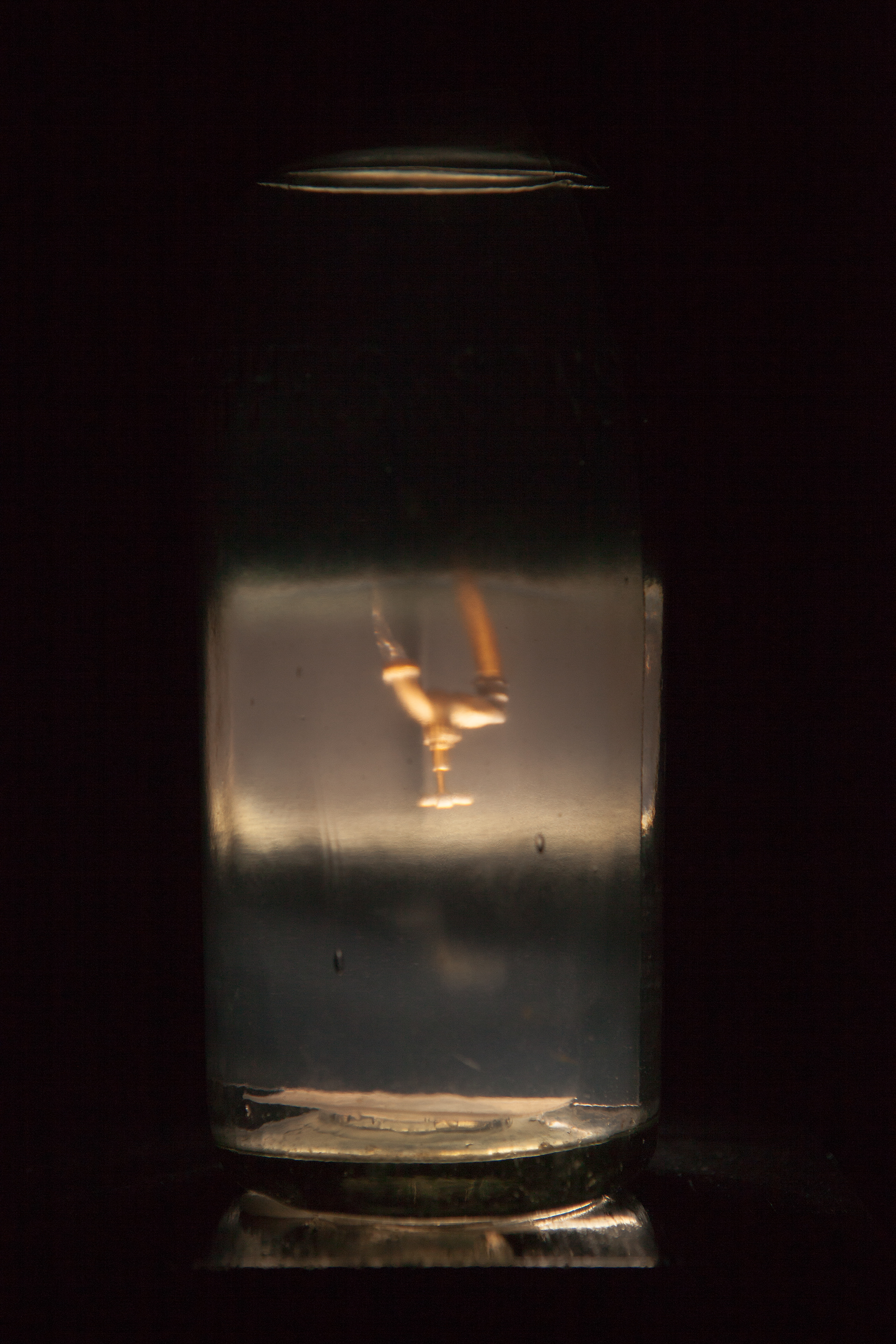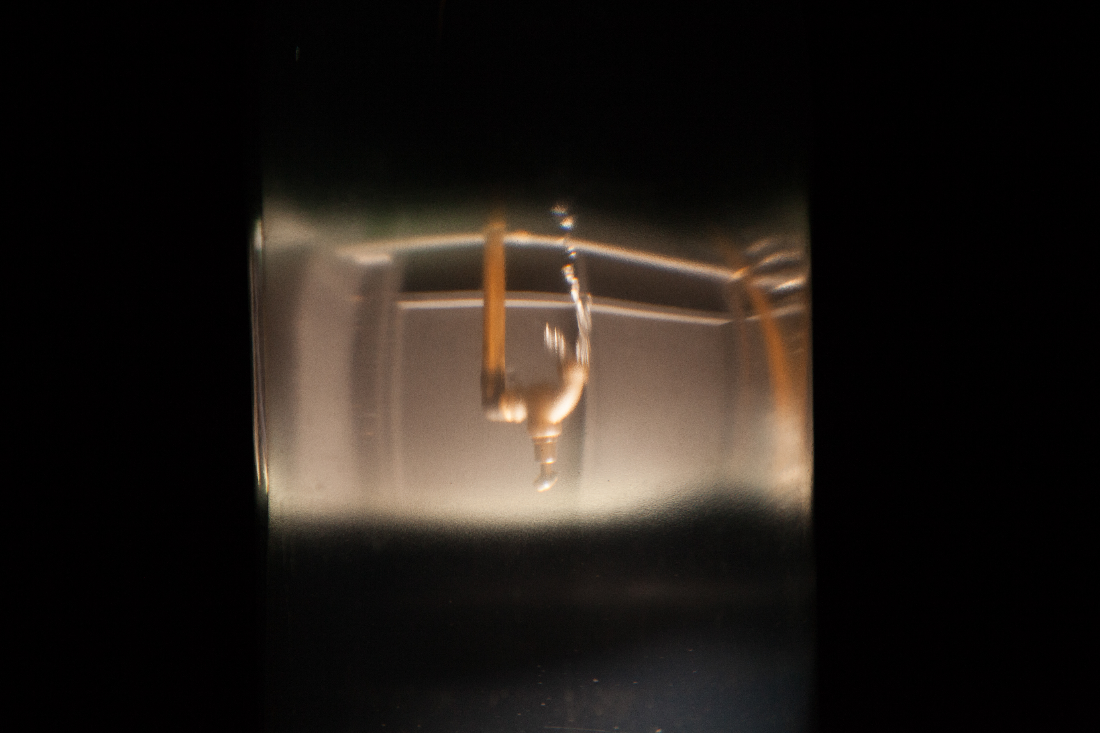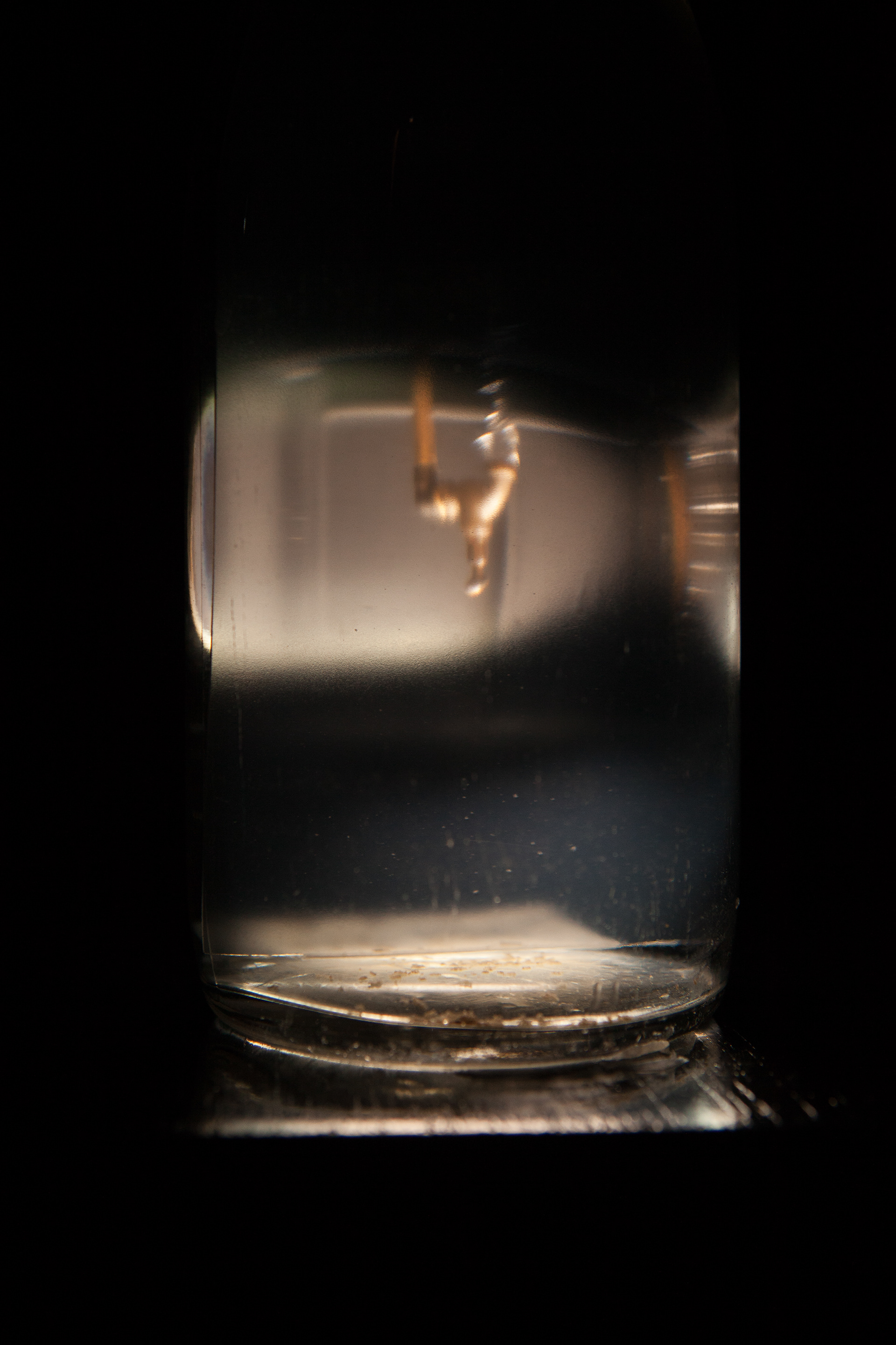 Documentation inside the installation of Everything flows, nothing remains I at the Adelaide Experimental Art Foundation. Visitors entered a darkened space and witnessed taps seemingly continuously running water upside down inside glass bottles and jars. The taps and pump were hidden in the back of the structure and projected into the bottles via glass lenses.
