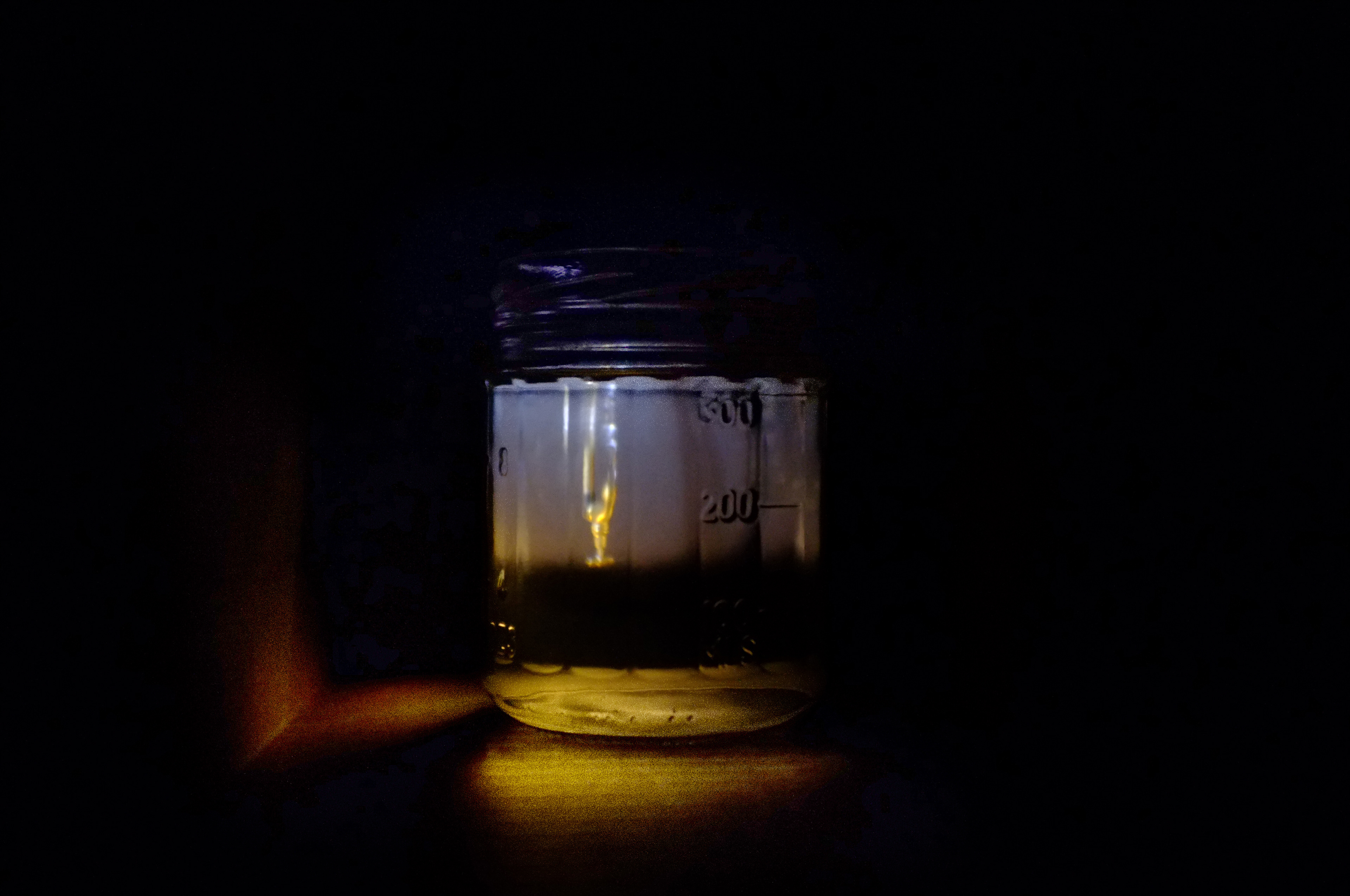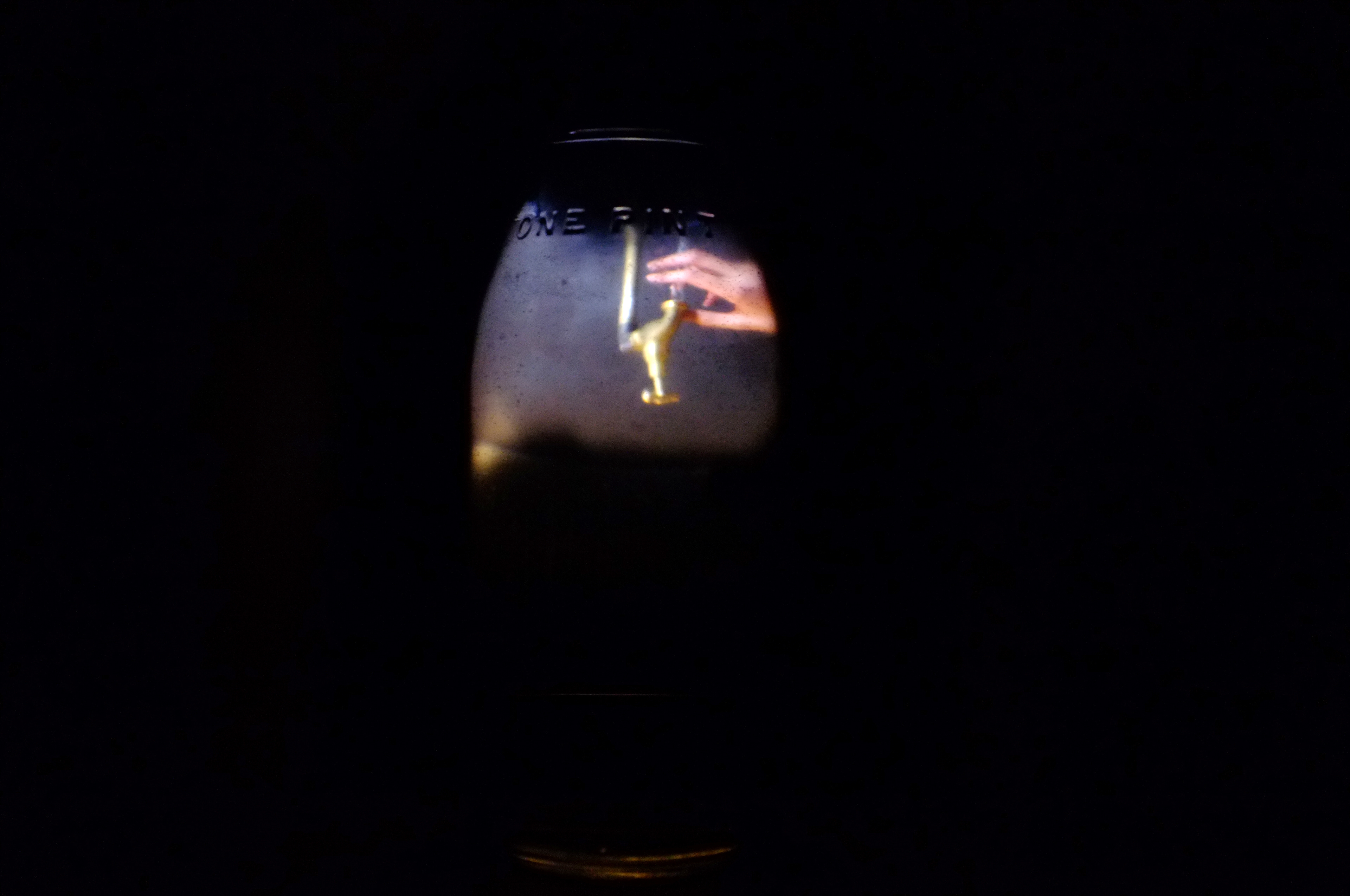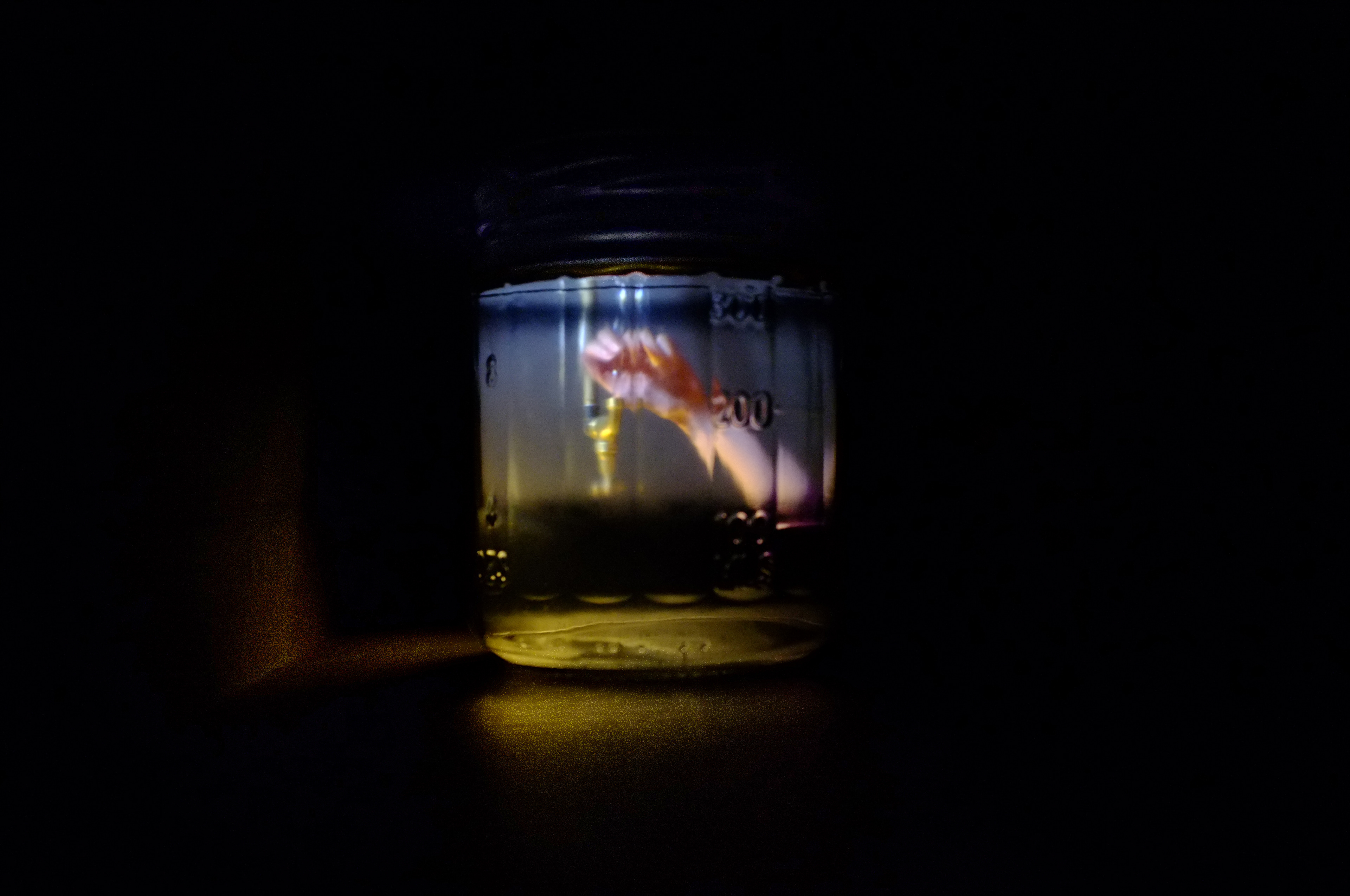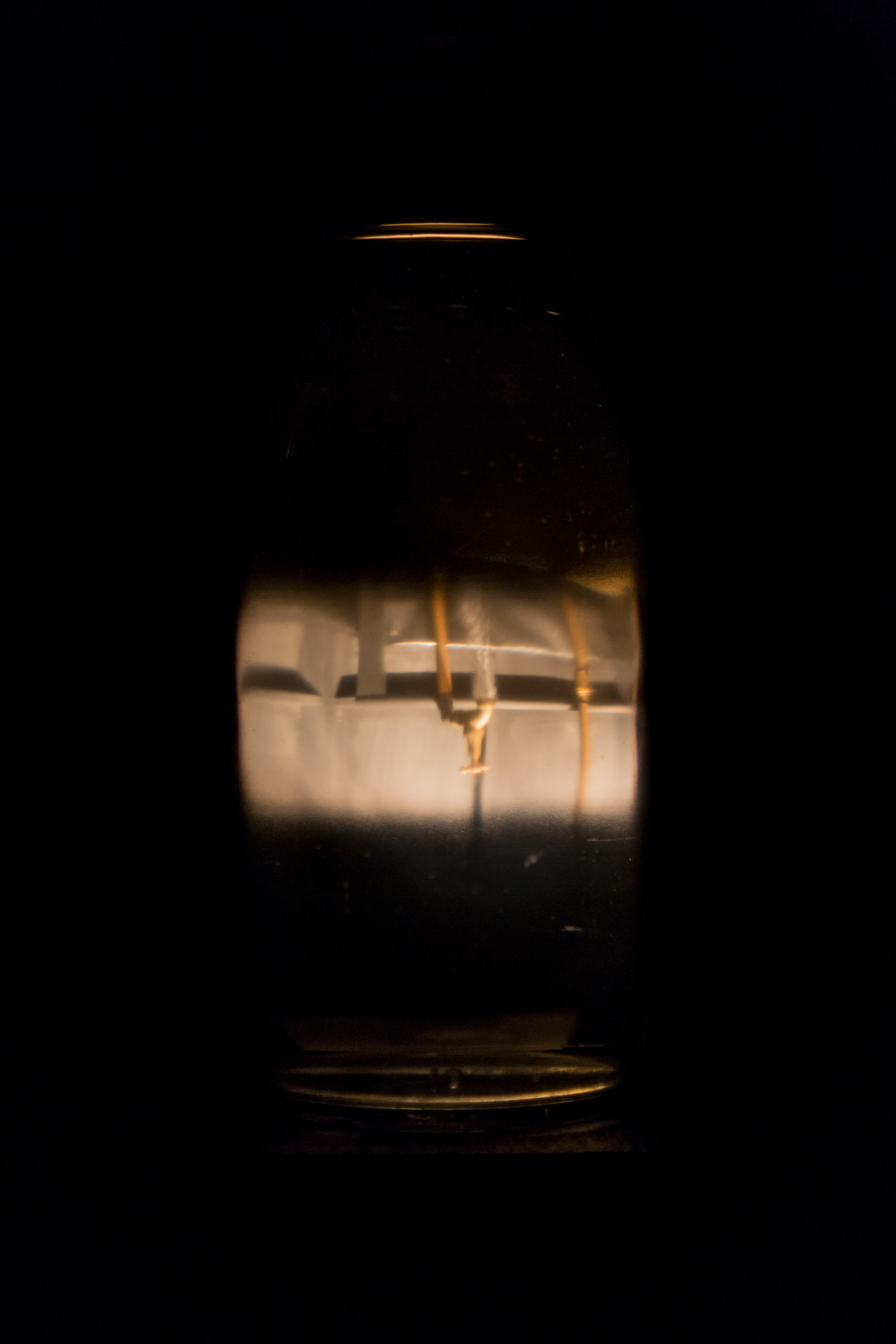 Documentation inside the installation of Everything flows, nothing remains I at the Adelaide Experimental Art Foundation. Visitors entered a darkened space and witnessed taps seemingly continuously running water upside down inside glass bottles and jars. The taps and pump were hidden in the back of the structure and projected into the bottles via glass lenses.