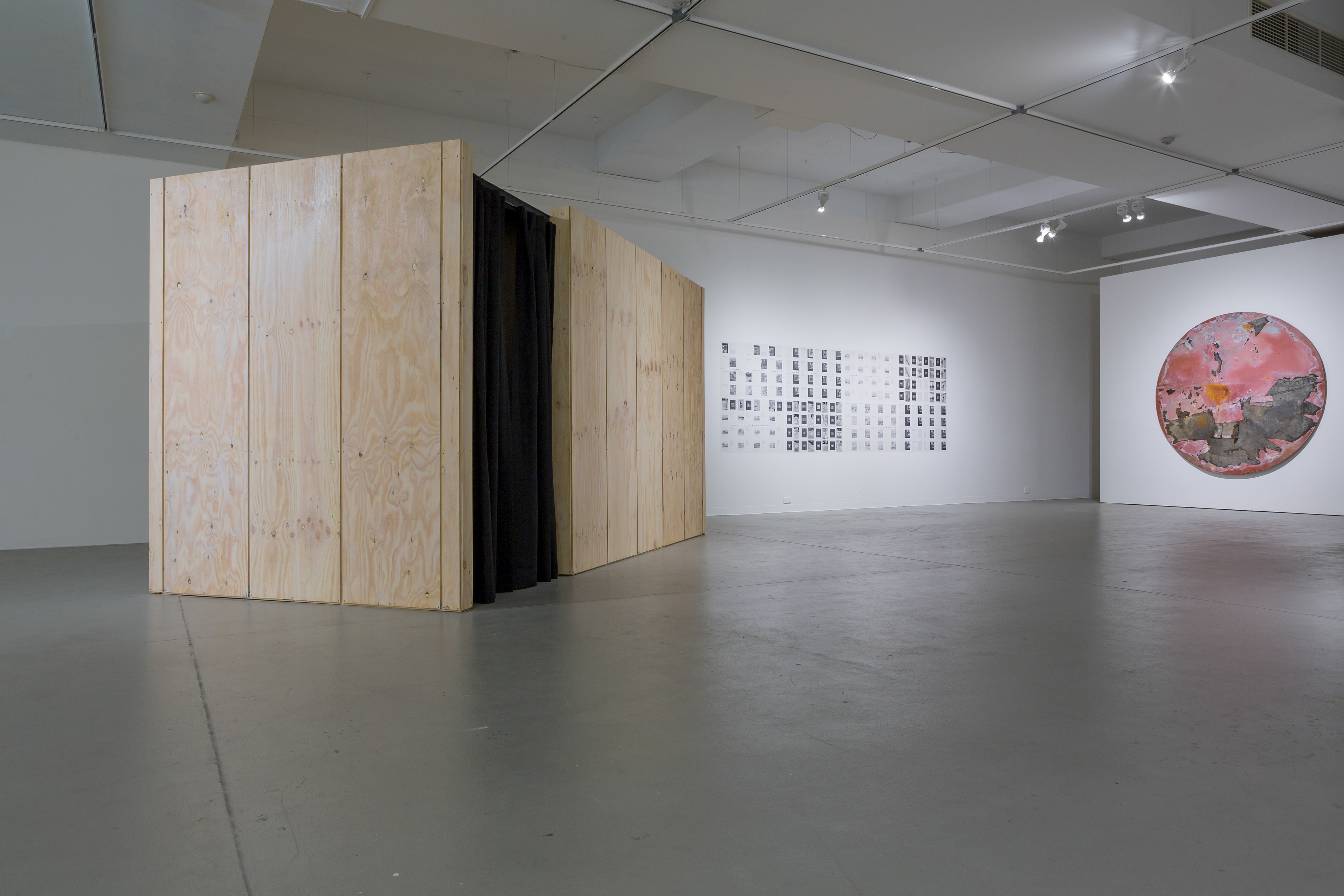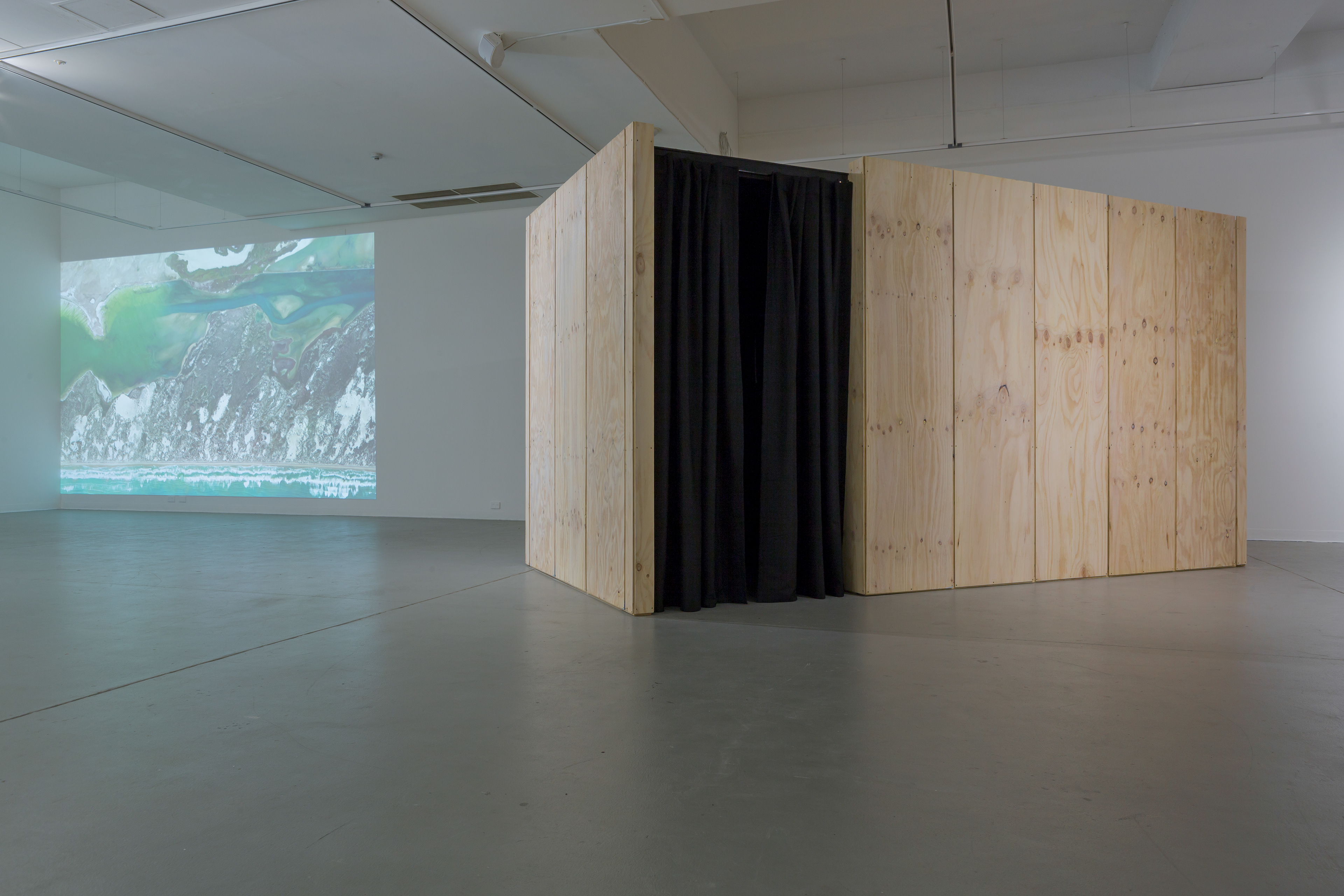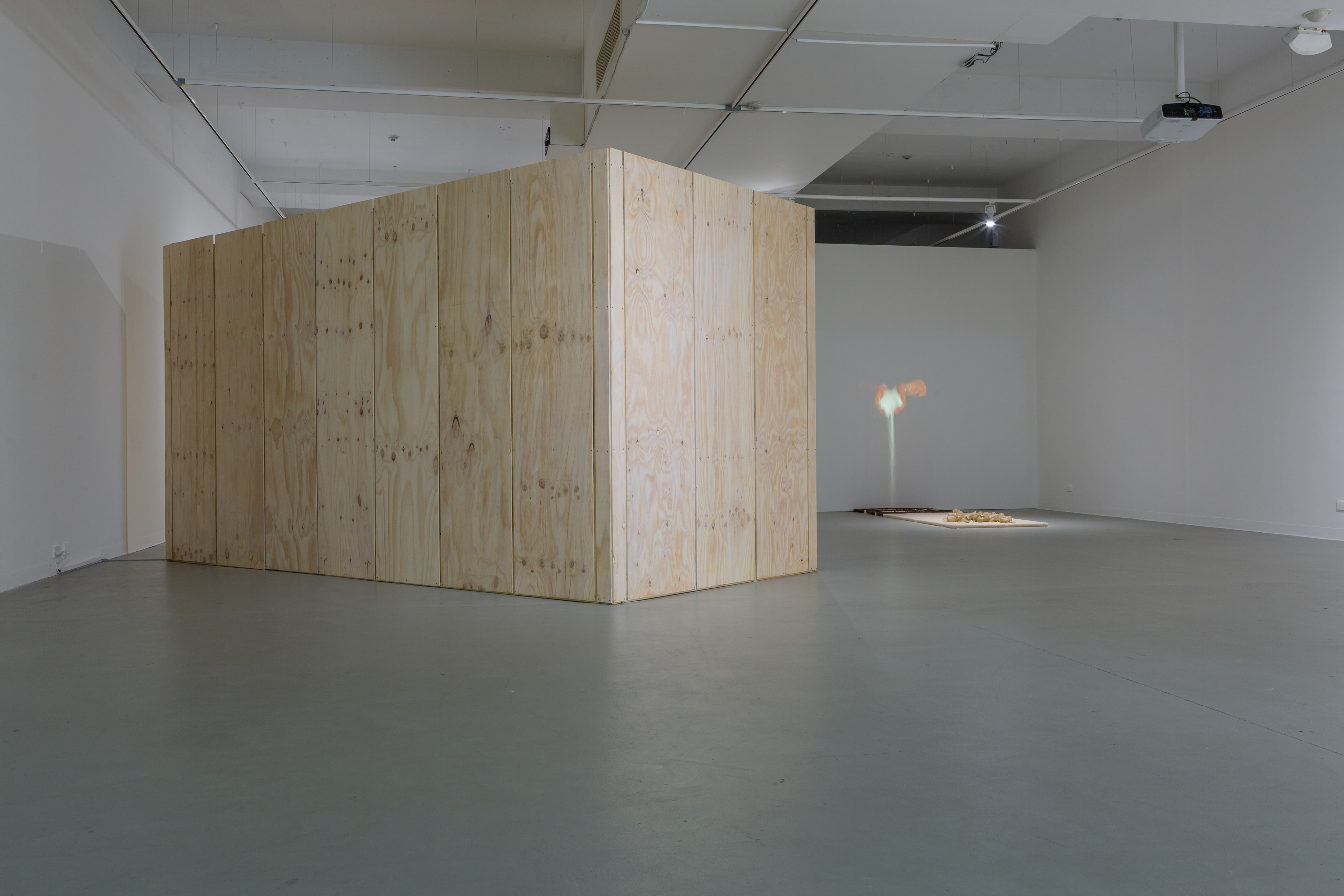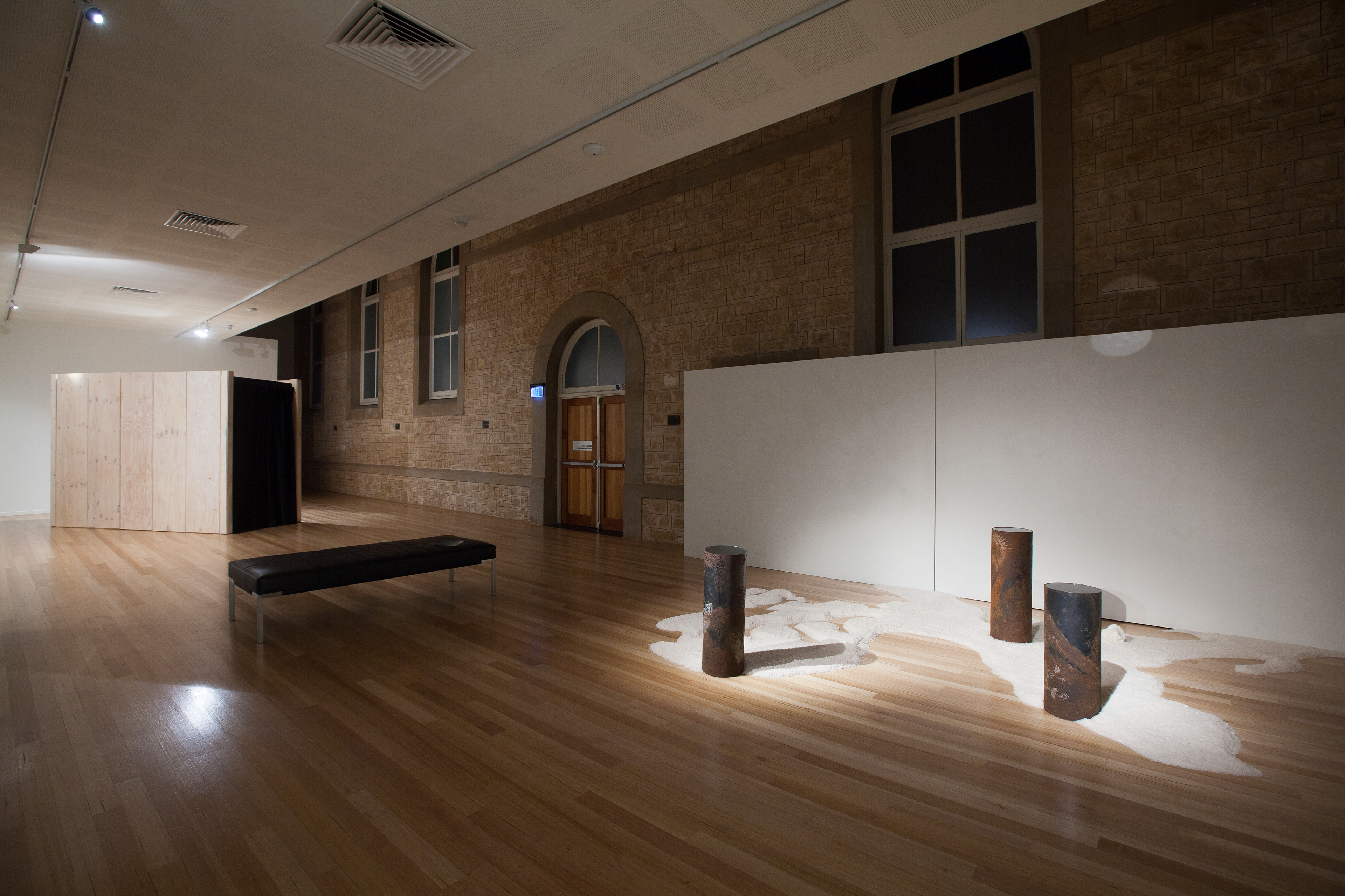 Documentation inside the installation of Everything flows, nothing remains I at the Adelaide Experimental Art Foundation. Visitors entered a darkened space and witnessed taps seemingly continuously running water upside down inside glass bottles and jars. The taps and pump were hidden in the back of the structure and projected into the bottles via glass lenses.