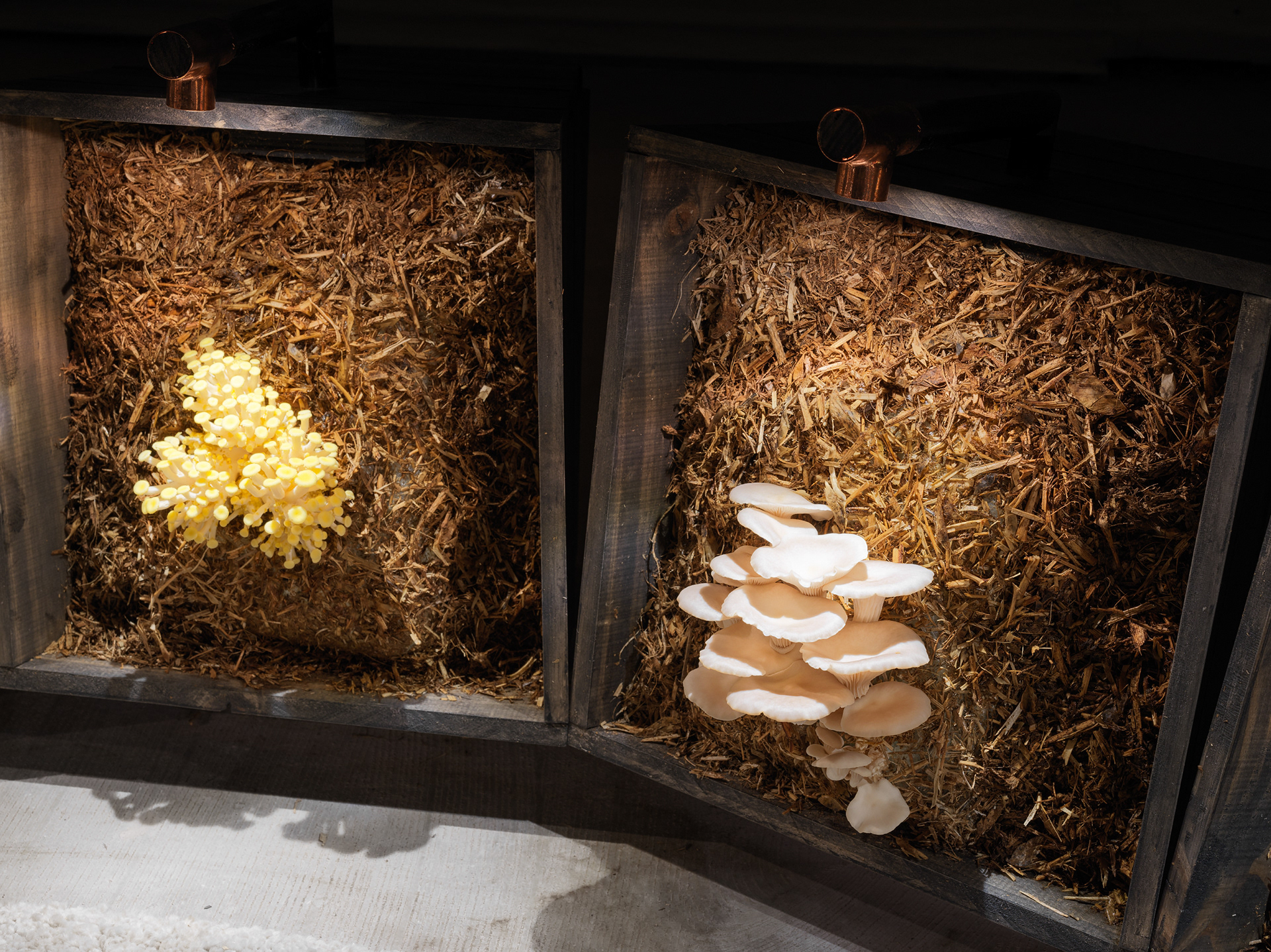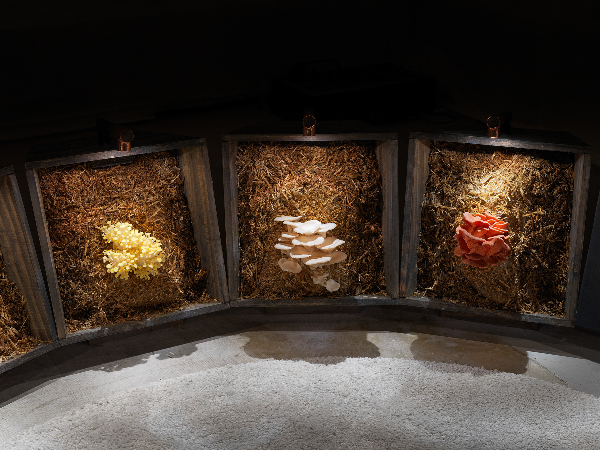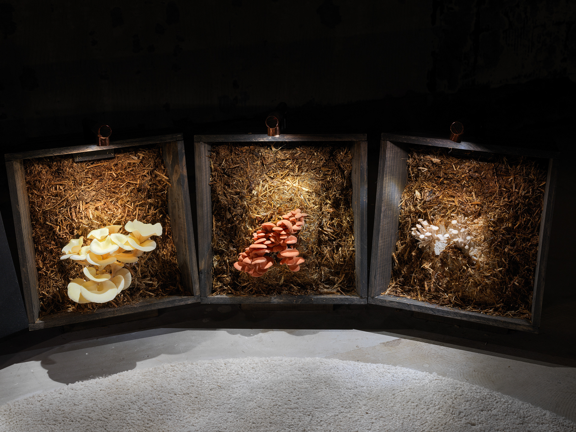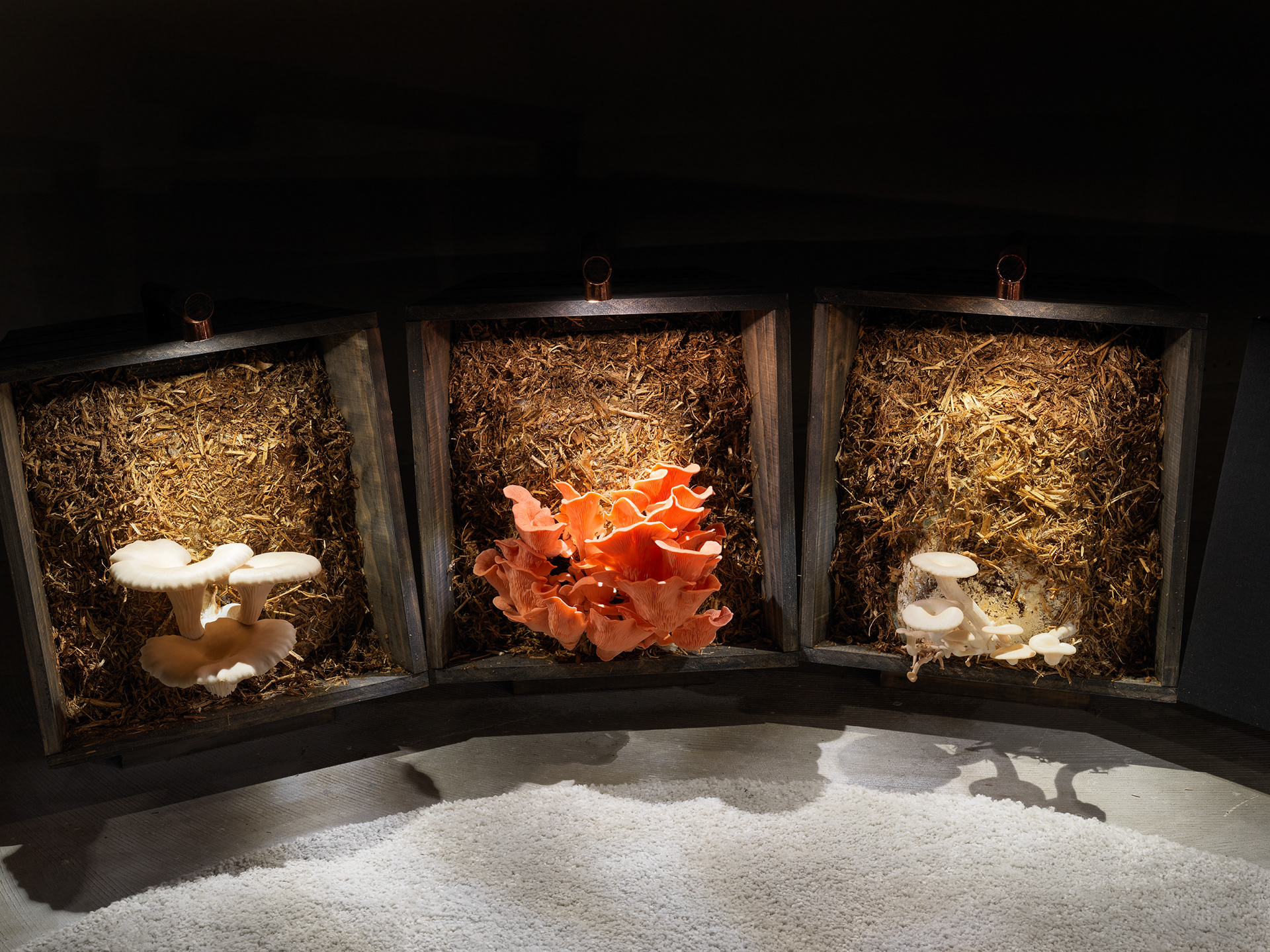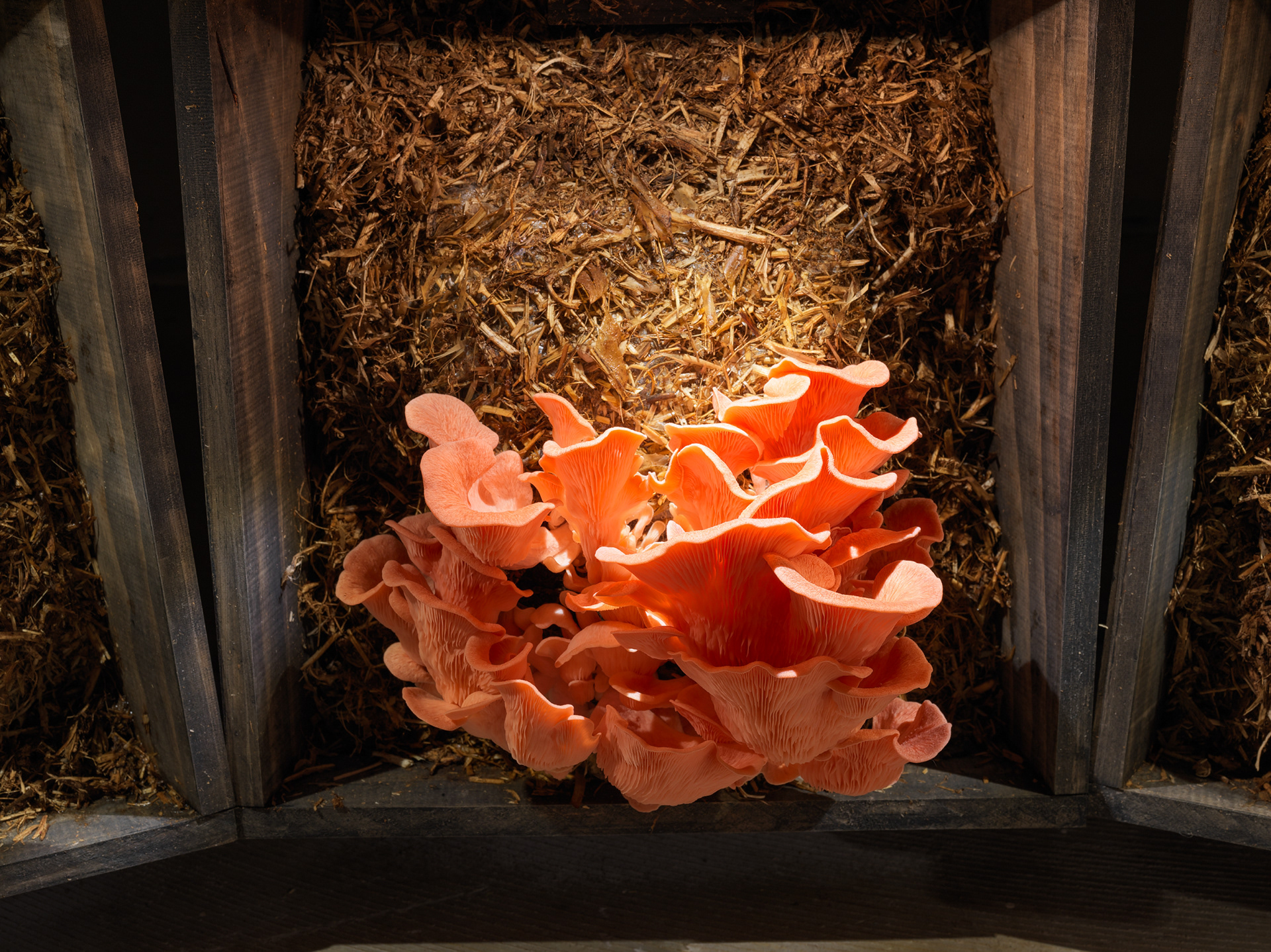 Heidi Kenyon, We shall by morning inherit the earth, 2022. Pleurotus ostreatus, citrinopileatus and djamor, timber and mixed media. Sound by Ben Davidson (Ben Sun) using electromagnetic sequences generated by the fungi. Photography by Grant Hancock.